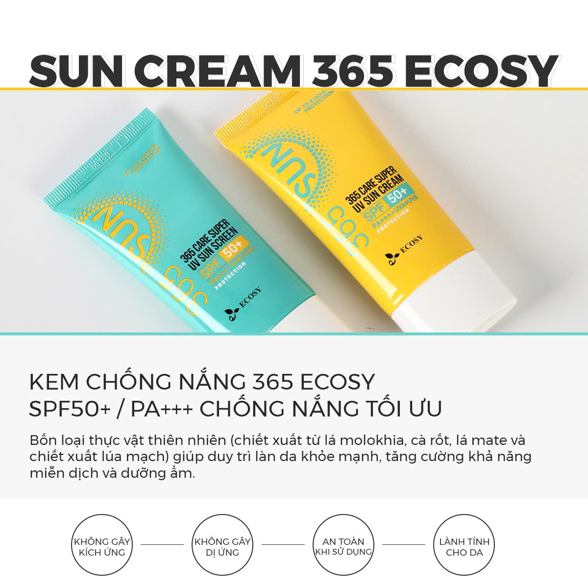Ánh nắng mặt trời không chỉ mang đến sức sống và năng lượng, mà còn là nguyên nhân chính gây ra nhiều vấn đề về da như lão hóa sớm, sạm da, và thậm chí là ung thư da. Để bảo vệ làn da một cách toàn diện, việc sử dụng kem chống nắng hàng ngày là bước không thể thiếu trong chu trình chăm sóc da. Hôm nay, chúng ta sẽ cùng khám phá hai sản phẩm kem chống nắng vượt trội từ ECOSY: 365 CARE SUPER UV SUN CREAM SPF50+/PA+++ và 365 Daily Care Blue Sun Cream SPF50+/PA+++. Với chiết xuất từ thiên nhiên và công nghệ chống nắng hiện đại, hai sản phẩm này không chỉ bảo vệ da khỏi tia UV mà còn mang lại nhiều công dụng khác giúp làn da luôn khỏe mạnh, mềm mại và được dưỡng ẩm tối ưu.