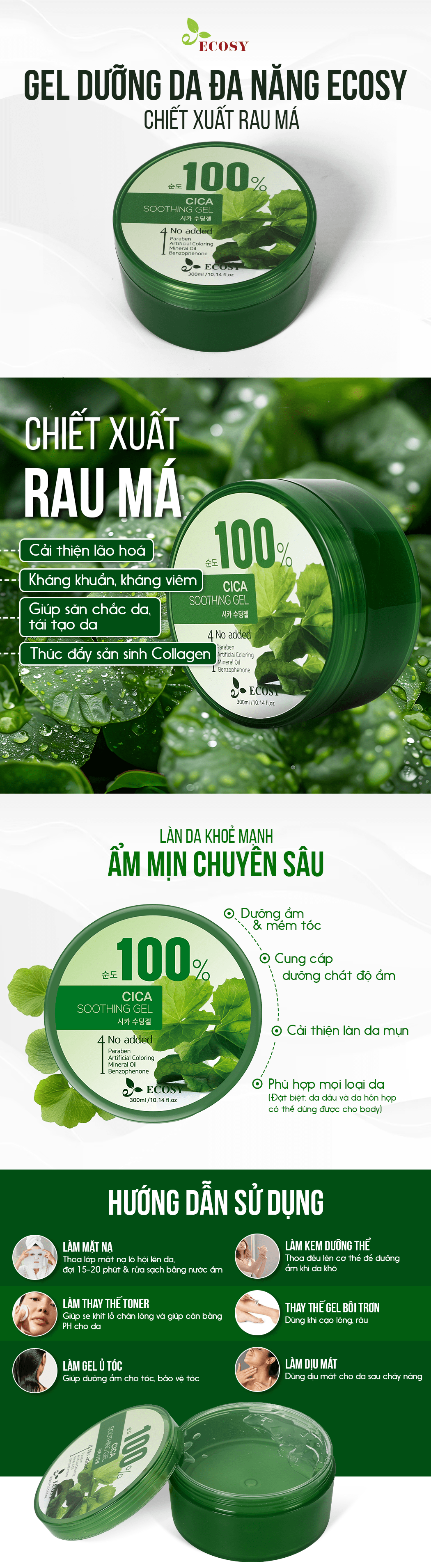 Nước, Dipropylene Glycol, Carbomer, Glycerin, Trietanolamine, Methylpropanediol, Phenoxyetanol, Dầu thầu dầu hydro hóa PEG-60, Chlorphenesin, Allantoin, Disodium EDTA, Butylene Glycol, Bột nước ép lá Aloe Barbadensis, Natri Hyaluronate, Chiết xuất Hamamelis Virginiana (Witch Hazel) , Chiết xuất Centella Asiatica (6ppm), 12-Hexanediol, Chiết xuất rễ cây Scutellaria Baicalensis, Chiết xuất rễ cây Polygonum Cuspidatum, Chiết xuất rễ cây Glycyrrhiza Glabra (Cam thảo), Chiết xuất lá Centella Asiatica (1ppm), Chiết xuất rễ cây Centella Asiatica (1ppm), Chiết xuất lá Camellia Sinensis , Chiết xuất hoa Chamomilla Recutita (Matricaria), Chiết xuất lá Rosmarinus Officinalis (Rosemary), Axit Asiatic, Asiaticoside, Acetyl Hexapeptide-8, Axit Madecassic, Madecassoside, Hương thơm, Limonene