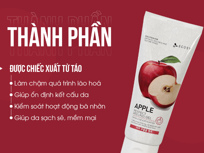 Táo là nguồn cung cấp dồi dào vitamin C và các chất chống oxy hóa, giúp bảo vệ làn da khỏi các gốc tự do gây hại, đồng thời kích thích tái tạo tế bào mới. Khi sử dụng Apple Perfect Peeling Gel, làn da không chỉ được làm sạch mà còn trở nên sáng mịn và tươi mới hơn. Hương táo tươi mát còn mang lại cảm giác dễ chịu, thư giãn cho người dùng.
