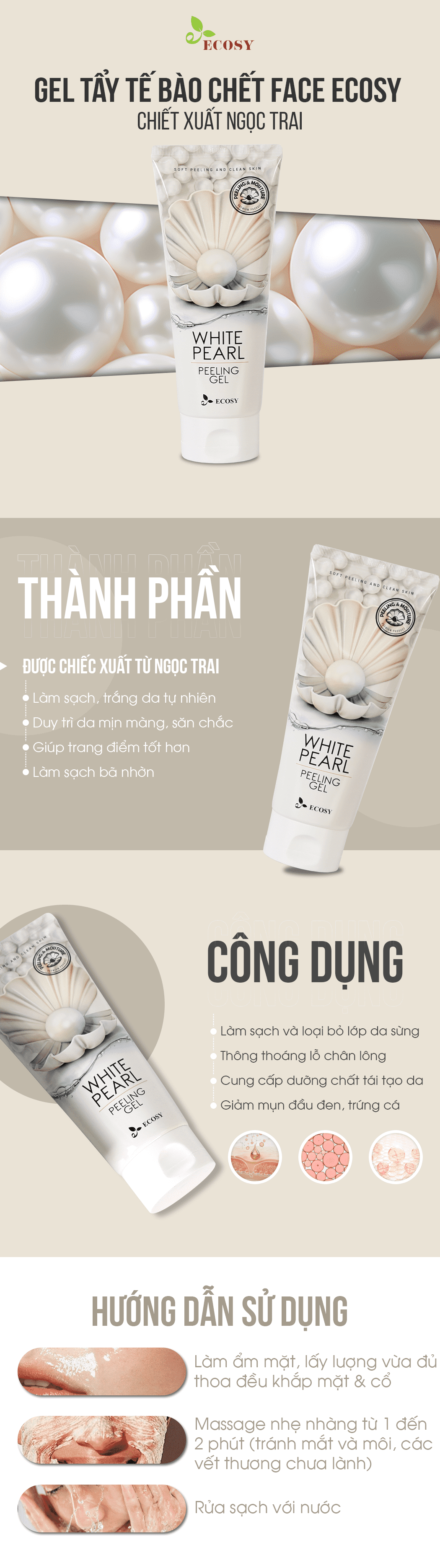 Gel tẩy tế bào chết White Pearl Peeing Gel Ecosy 150ml được chiết xuất từ bột ngọc trai giúp làm sạch da, làm trắng da một cách tự nhiên. Đồng thời duy trì làn da mịn màng làm săn chắc cơ mặt, giúp khuôn mặt khi trang điểm bắt phấn tốt hơn