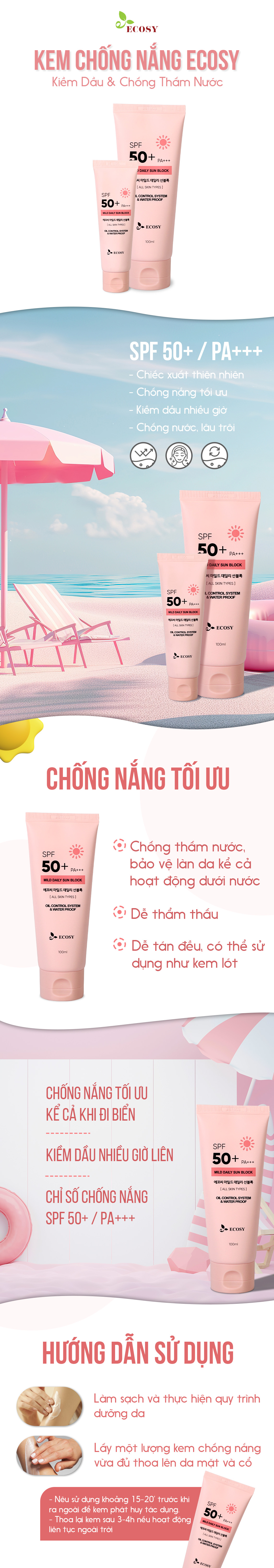 - Sau khi làm sạch và thực hiện quy trình dưỡng da, lấy một lượng kem chống nắng Ecosy Mild Daily Sun Block - Oil Control System & Water Proof SPF 50+/PA+++ 100ml vừa đủ thoa lên da mặt và cổ.