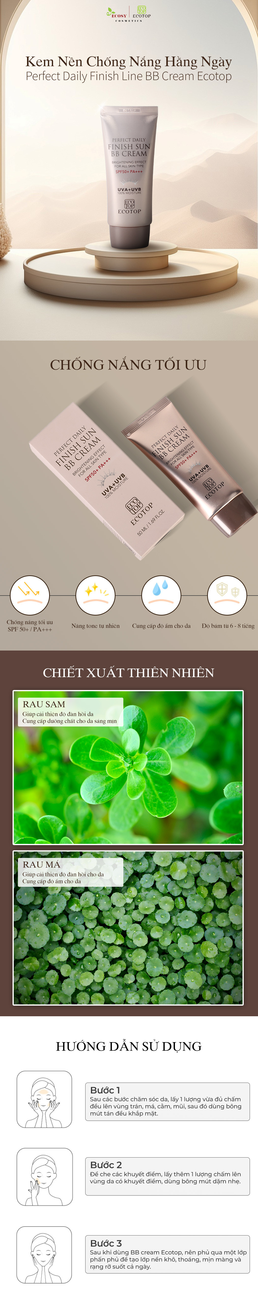 - Kem nền chống nắng BB Cream Ecotop 50ml còn tạo độ ẩm cân bằng cho làn da tạo cảm giác thoải mái và thông thoáng. Kem giàu dưỡng chất, vitamin và khoáng chất, nhẹ nhàng chăm sóc mang lại cho làn da vẻ rạng rỡ và trắng sáng.