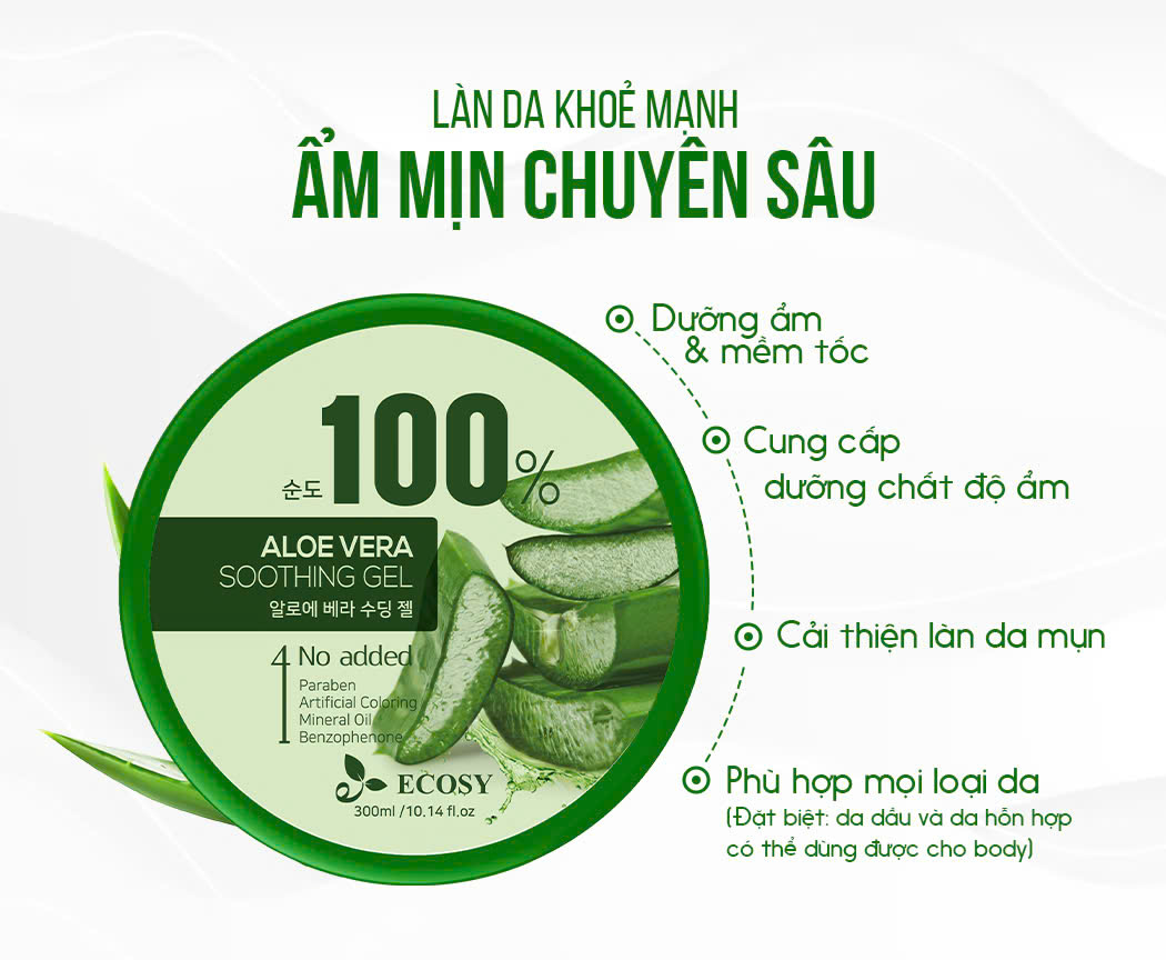 Một trong những ưu điểm nổi bật của Soothing Aloe Vera Gel ECOSY là khả năng làm dịu các nốt mụn. Tinh chất lô hội không chỉ giúp làm mát mà còn có tính kháng viêm tự nhiên, giúp giảm sưng tấy và nhanh chóng làm dịu các nốt mụn. Với khả năng thẩm thấu nhanh, gel này giúp da nhanh chóng hồi phục sau những tổn thương do mụn, giúp bạn lấy lại làn da mịn màng mà không để lại dấu vết.