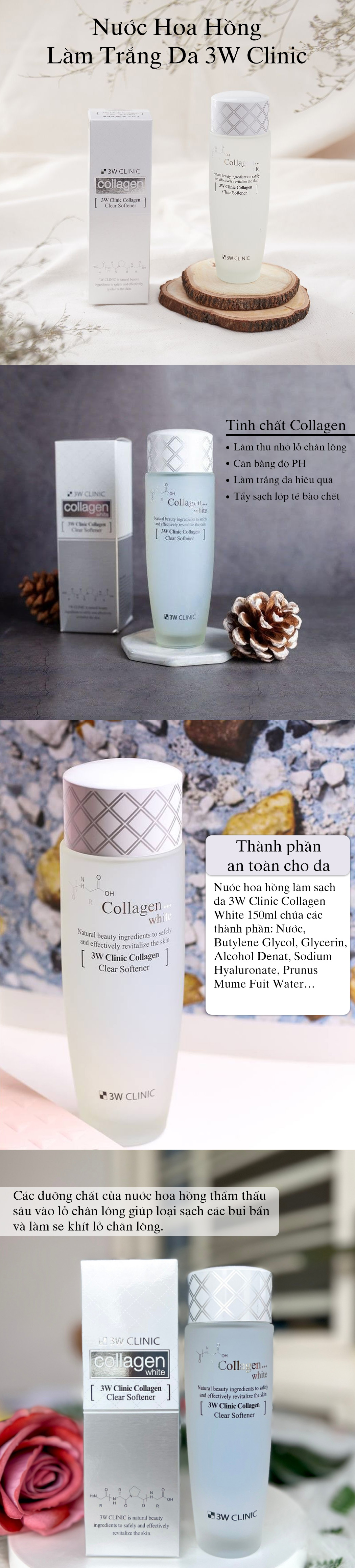 - Nước hoa hồng làm trắng da 3W Clinic Collagen Clear Softener làm thu nhỏ lỗ chân lông, cân bằng độ PH trên da và ngăn ngừa sự xuất hiện của các nếp nhăn.