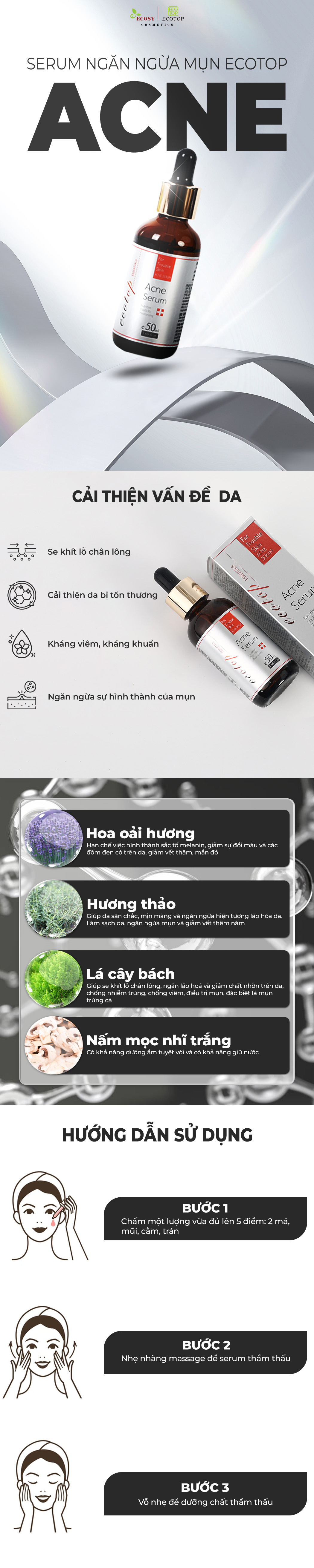 - Serum trị mụn Ecotop có thể loại bỏ được các loại mụn trứng cá , mụn bọc ,mụn đầu đen và các vết thâm , dưỡng trắng và trẻ hóa làn da .