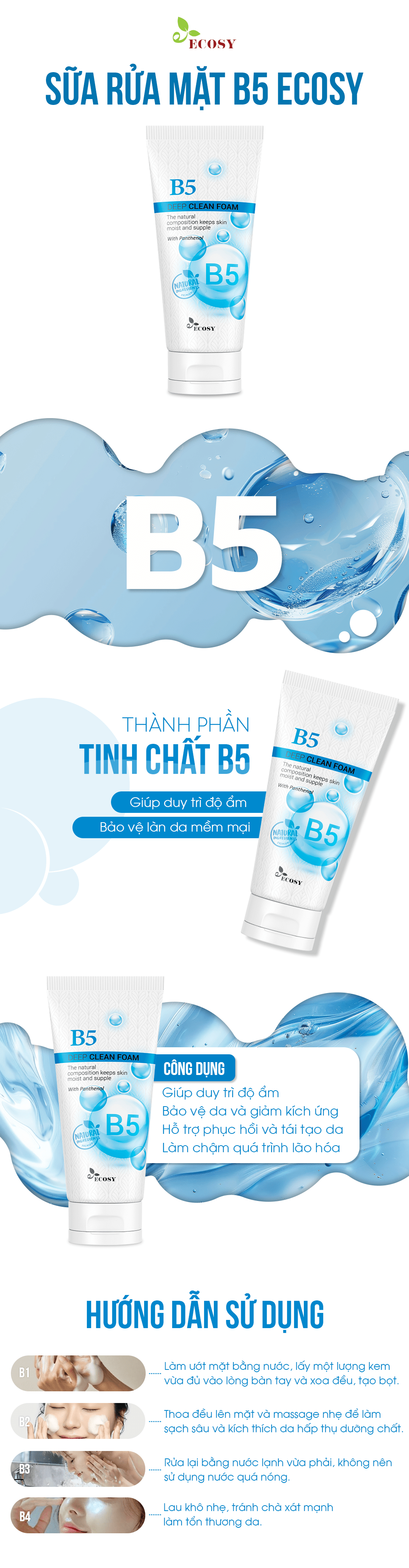 Sữa rửa mặt làm sạch sâu chứa B5 Ecosy giúp duy trì độ ẩm và bảo vệ làn da mềm mại, cung cấp độ ẩm giúp da trở nên mịn màng.