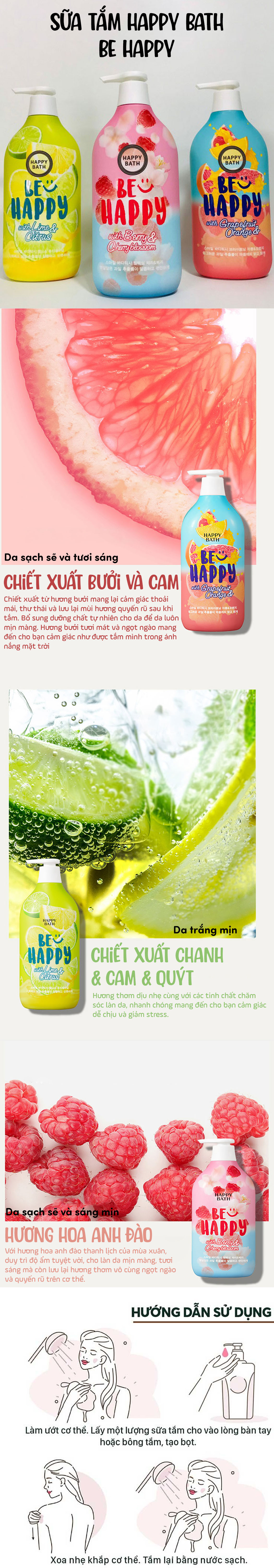 Sữa Tắm Happy Bath Tinh Chất Bưởi Grapefruit Essence Body Wash 900g chứa 5 loại dầu thực vật giúp dưỡng ẩm mà không làm căng da ngay cả sau khi tắm (dầu dừa, dầu jojoba, dầu ô liu, dầu argan, dầu hạt hướng dương).