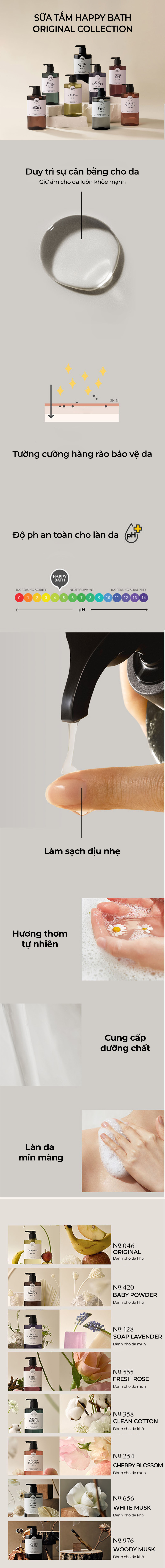 Sữa tắm Happy Bath Collection Body Wash 910g là dòng sữa tắm cao cấp dạng gel có khả năng làm sạch da một cách nhẹ nhàng cùng công thức nhẹ dịu giàu độ ẩm, vô cùng ẩm mượt cho làn da, làm sáng da ngay sau khi tắm nhưng vẫn đảm bảo sạch sâu lỗ chân lông, lưu giữ hương thơm lâu, quyến luyến không rời mãi trên da như lớp lụa trong suốt thanh nhã. Sữa tắm Happy Bath còn có chứa polyphenol chuyển đổi thành vitamin B5 khi tiếp xúc với da, giúp làm săn chắc và giữ ẩm cho da, phục hồi làn da tổn thương và cháy nắng.