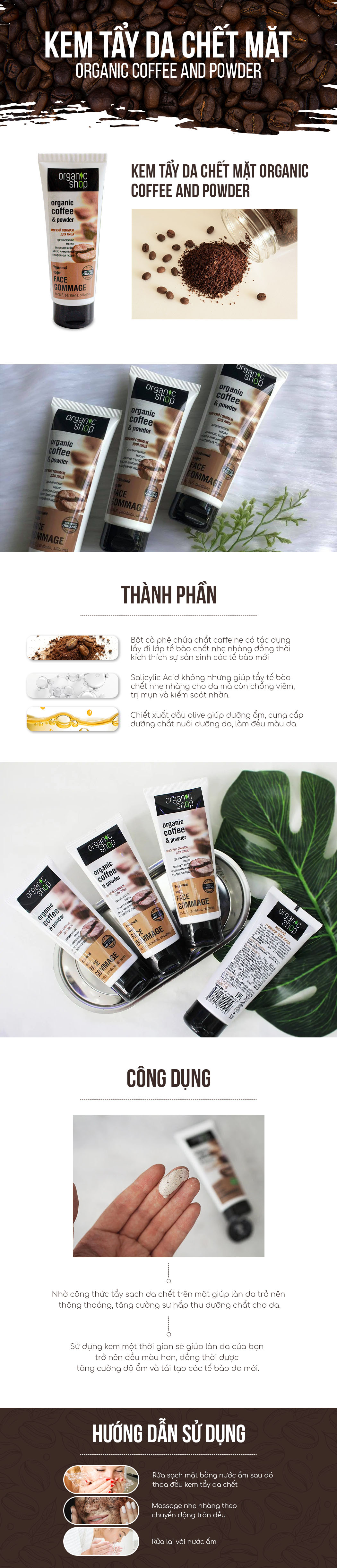 Aqua, Cetearyl Alcohol, cao lanh, axit stearic, Glyceryl Stearate, Theobroma Cacao, Olea Europaea, dầu ôliu, Macadamia Ternifolia Seed Oil (dầu Macadamia), Glycerin, dầu hữu cơ Coffea Arabica (chiết xuất cà phê), Amorphophallus, Salicylic Acid, Tocopheryl Acetate, Benzyl Alcohol, Xanthan, axit benzoic, axit Sorbic, Natri, Hydroxide, Tinh dầu sả, ...