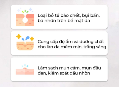 - Loại bỏ tế bào chết dịu nhẹ: Công thức gel không chứa hạt, giúp làm sạch lớp tế bào chết, bụi bẩn mà không gây kích ứng hay tổn thương da.