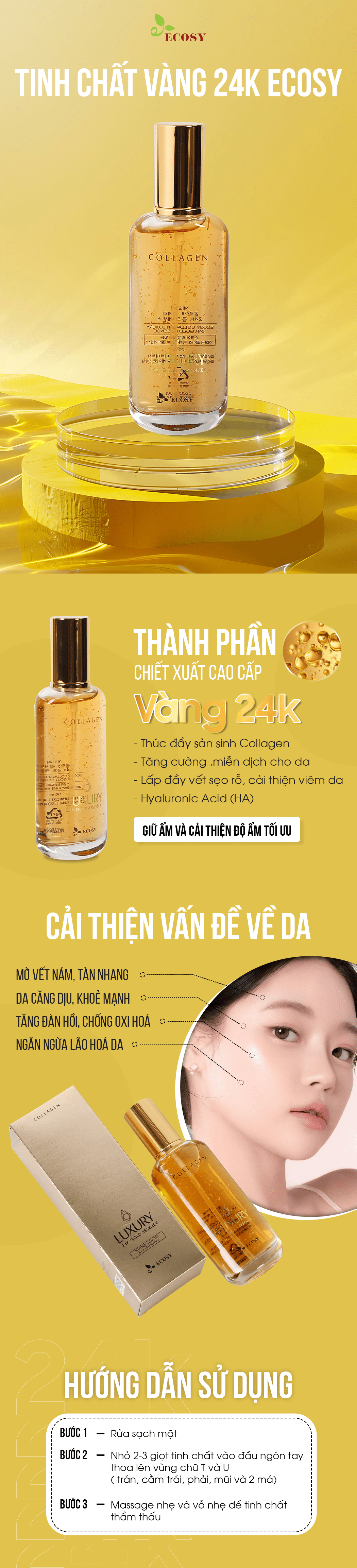 Chiết xuất từ Vàng 24K giúp thúc đẩy quá trình sản sinh Collagen, tăng cường hệ miễn dịch cho da, làm đầy vết sẹo rỗ, giảm viêm da; Hyaluronic Acid (HA) giúp giữ lại và cải thiện độ ẩm tối ưu.